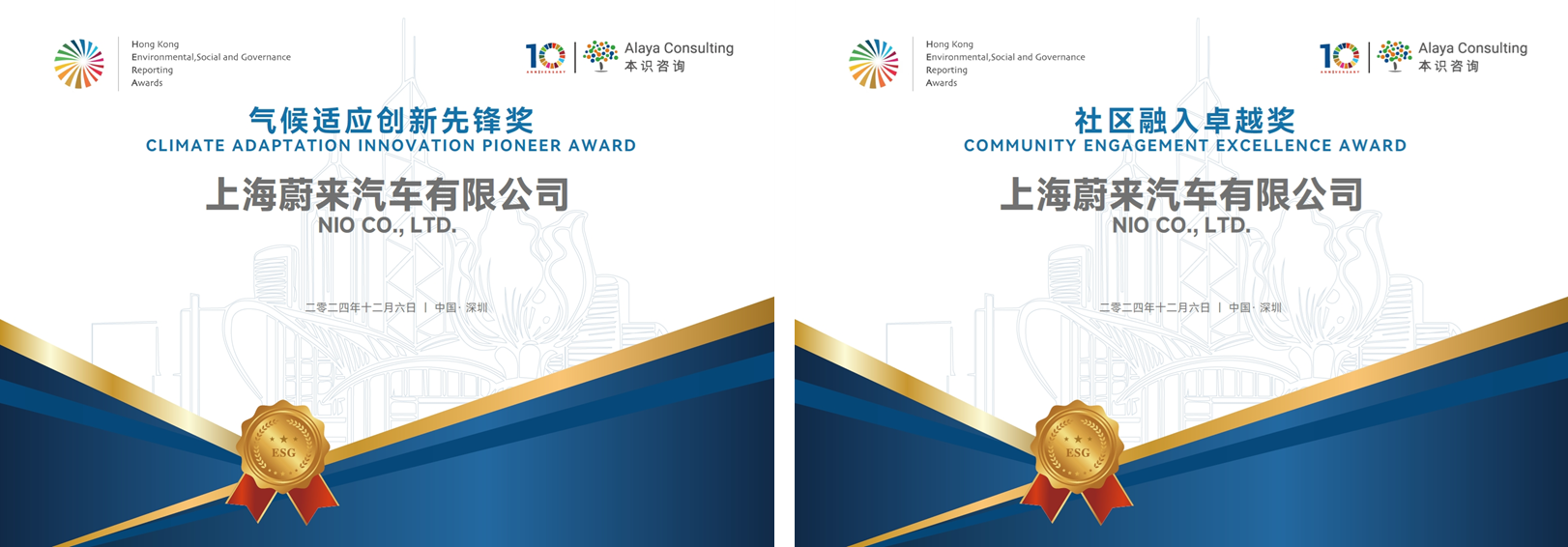 Recently, at the 2024 Greater Bay Area Sustainability Forum & Hong Kong ESG Reporting Awards(HERA) Ceremony, NIO was honored with the Climate Adaptation Innovation Pioneer Award and the Community Engagement Excellence Award for its outstanding performance in environmental, social and corporate governance (ESG). This recognition not only reflects the industry recognition, but also demonstrate NIO's mission to 'Shaping a Sustainable and Brighter Future Together'.